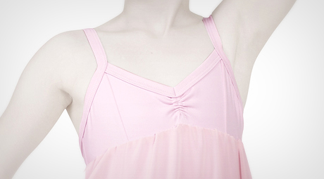 本商品はダンス用キャミソールドレスです。ネック部分はすっきりとしたVネック仕様。トップス部分はしっかりとしたフィット感、バスト下でシルエットを切り替えフレアなシルエットに仕上げました。
