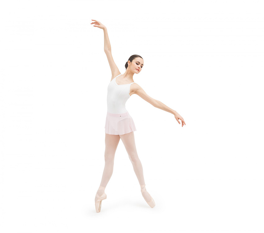 レオタードとレイヤードして着こなせるショート丈のフィッシュネットスカート。透け感が美しい素材で軽やかさを演出。やや後ろ下がりのシルエットに仕上げています。左ウエストのロゴ入りサークルプレートがさりげないポイントに。