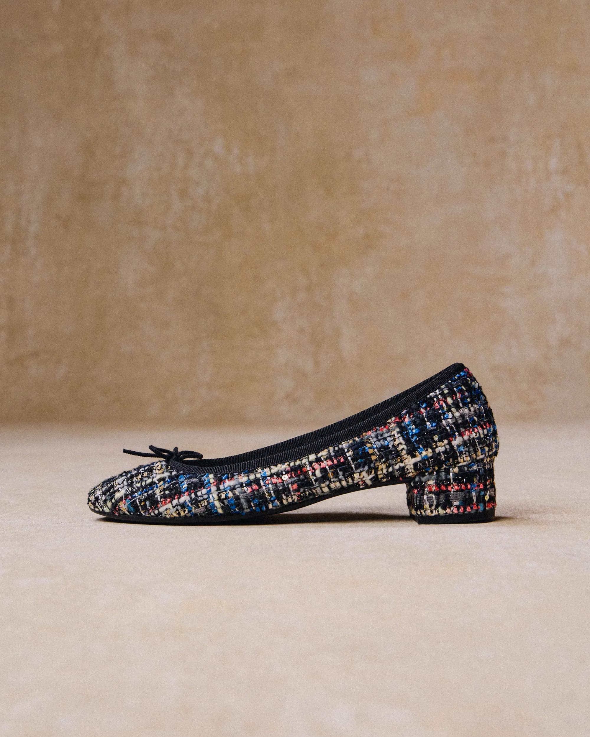 カラフルなツイード生地のエレガントなバレリーナシューズ。ラウンドトゥと小さなリボンが愛らしいデザイン。太めのヒールとラバーソールで滑りにくいのもうれしいポイント。いつものコーディネートにプラスしておしゃれなお出かけスタイルが完成します。
