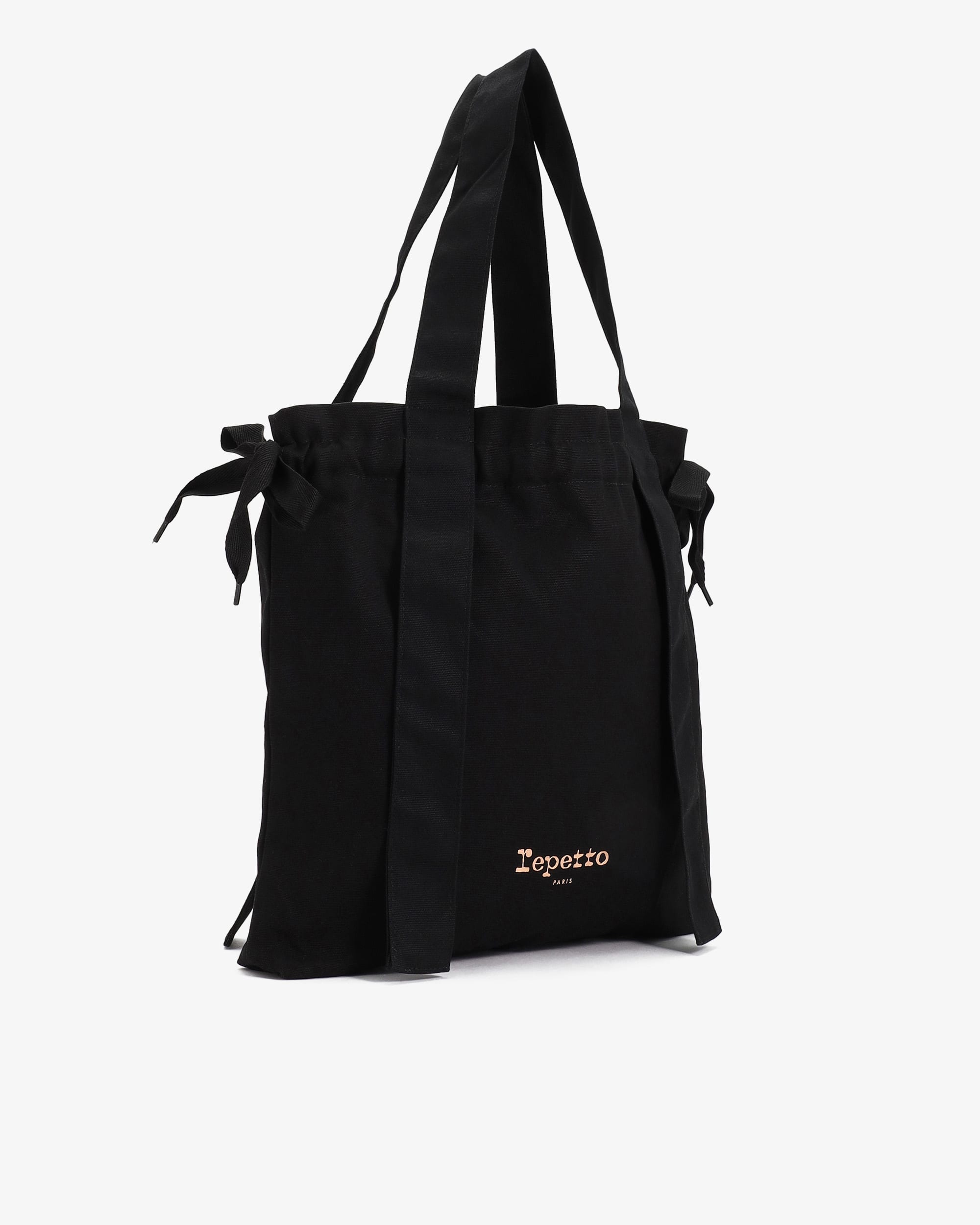 サイドリボンと長めのストラップが愛らしい、巾着仕様のトートバッグ。ソフトで軽量なキャンバス生地を使用し、フロント下部にはワンポイントのRepettoロゴを配置。日常からレッスン用、サブバッグにと幅広くお使いいただけるアイテムです。