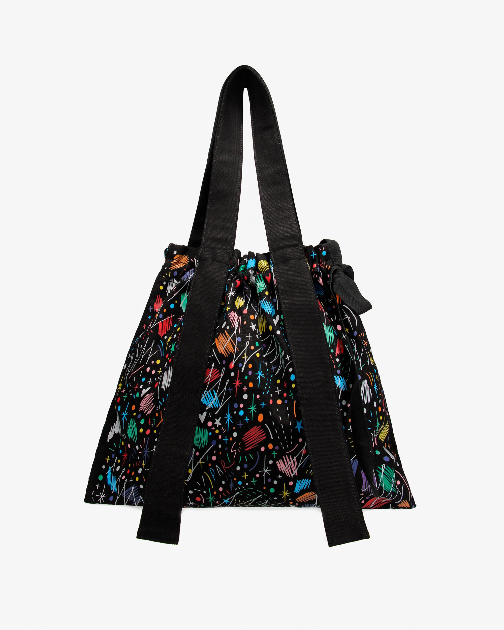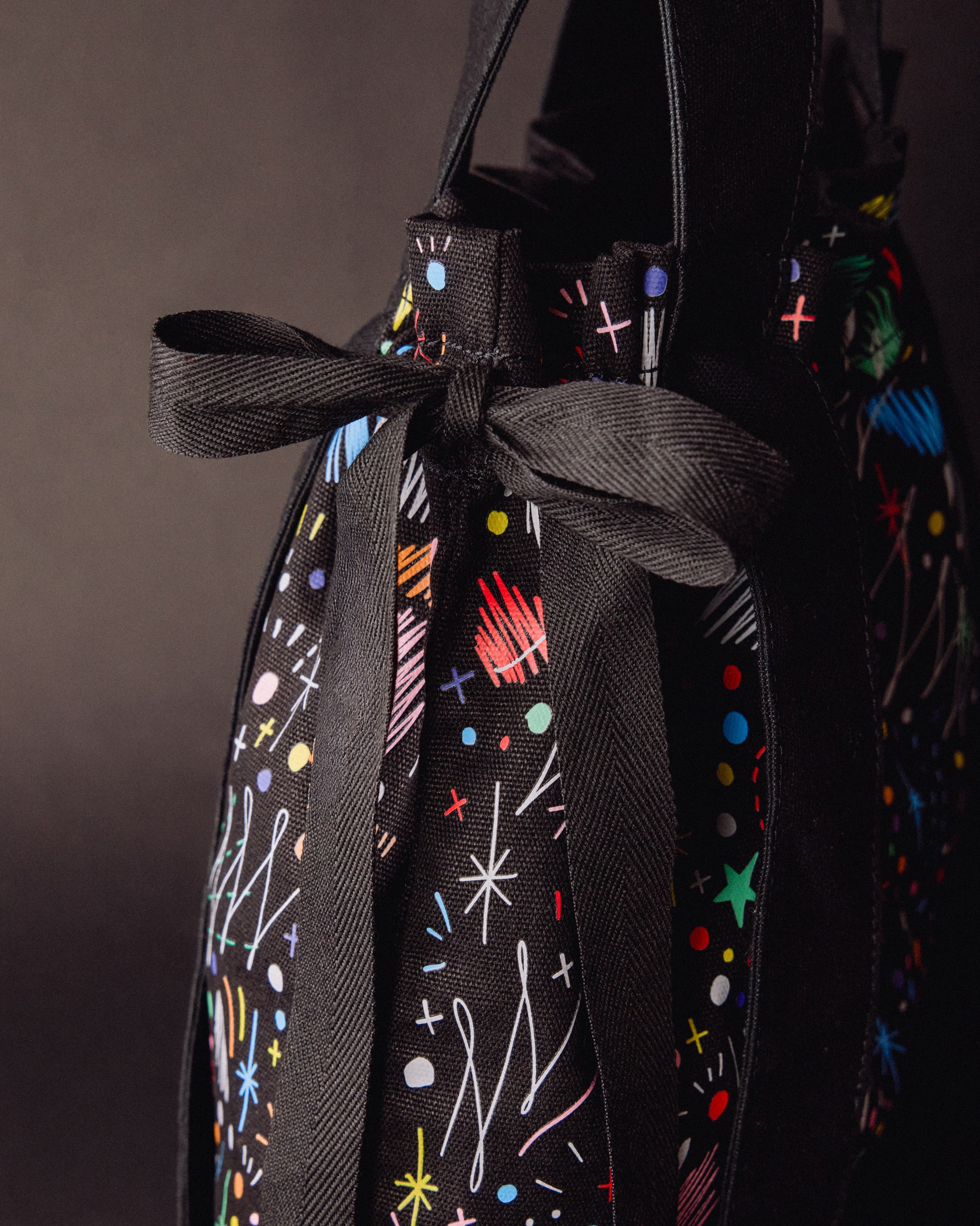 本カプセルコレクションでは、サイドのリボンが目を引くキャンバストートバッグをセレクト。ドローコードを絞ることでシルエットを自在に調整でき、その日の荷物やスタイリングに合わせて、シャープなスクエアフォルムから柔らかな丸みのある形状まで、異なる表情を楽しめるのが魅力です。しっかりとしたキャンバス生地を使用し、A4サイズも収まる機能的なサイズ感はデイリーユースに最適。ブランドのルーツであるバレエのエレガンスと、エネルギッシュなグラフィックが融合した、日常を彩る特別なバッグに仕上がりました。