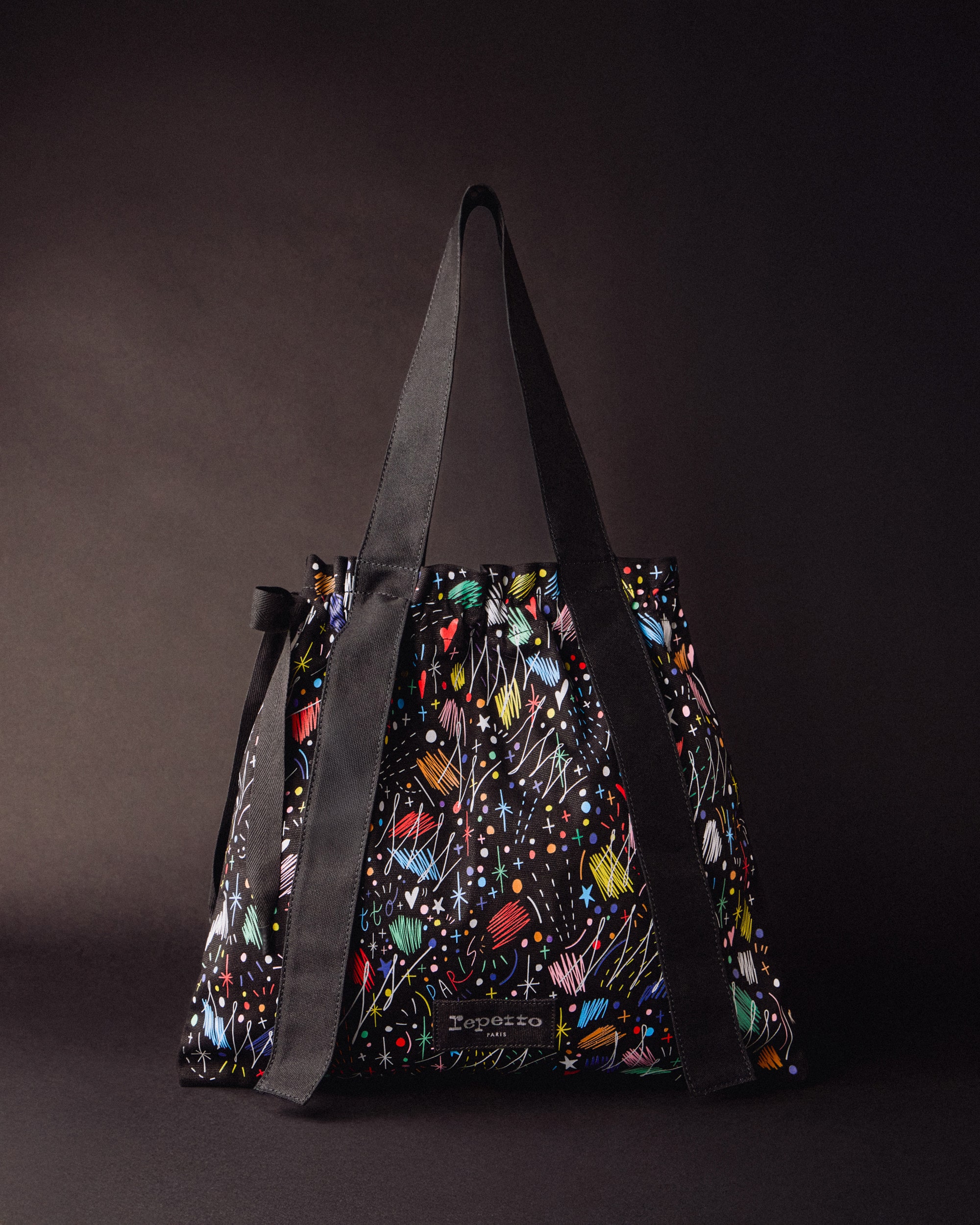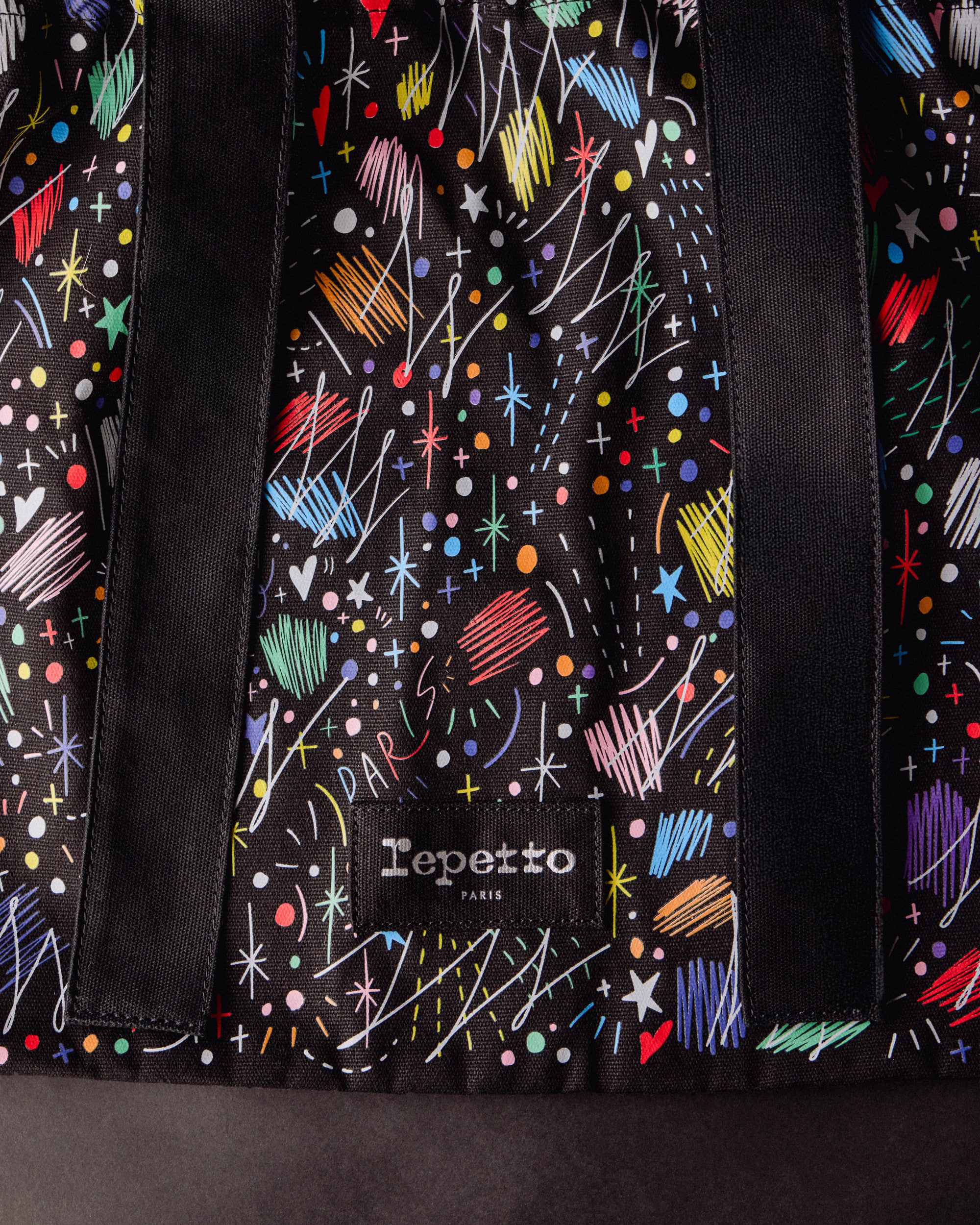 同氏によって生み出されたオールオーバー・パターンは、既存のアートワークから着想を得たもの。鮮やかな色彩が弾けるように広がり、Shogo Sekine氏の大胆なカラーパレットと、表現豊かなディテールを愛するレペットとの共通の感性を映し出しています。